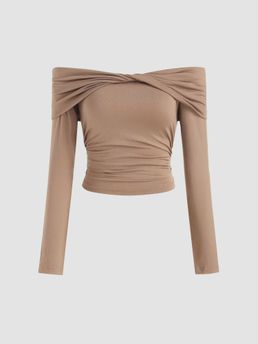 Solid Off-Shoulder Twist Ruched Long Sleeve Top